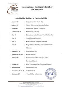 The International Business Chamber of Cambodia (IBC) would like to announce the 2026 Public Holidays in Cambodia as for your reference in accordance with the Sub-Decree No. 204/24 OrNKr/BK on